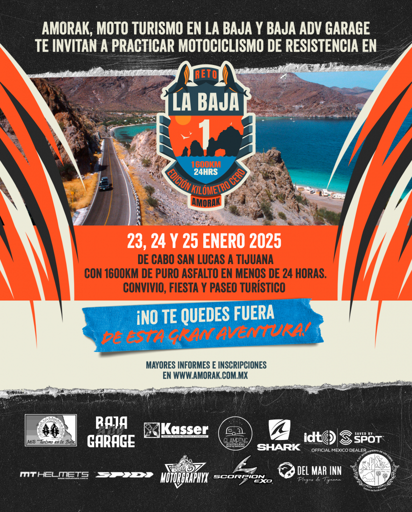 AMORAK, Moto Turismo en La Baja y Baja ADV GARAGE los invitan a participar en la rodada de Certificación avalada por la Asociación de Motociclistas de Resistencia y Alto Kilometraje A.C. (AMORAK) que lleva por nombre Reto La Baja 2025, Edición Kilómetro Cero donde se practica Motociclismo de Resistencia y que se llevará a cabo dentro de los estados de Baja California y Baja California Sur siguiendo una ruta 100% sobre carreteras de asfalto con una longitud de poco más de 1600 kilómetros teniendo como límite 24 horas para poder recorrerlo de principio a fin. La ruta fue elaborada por el experimentado motociclista Felipe Salmán misma que inicia en San José del Cabo, BCS y finaliza en Tijuana, BC, no sin antes disfrutar de algunas de las carreteras más escénicas junto a sus hermosos paisajes y diversos ecosistemas mientras pones a prueba tus habilidades como motociclista al rodar sus desafiantes caminos plagados de buenas curvas e hipnotizantes rectas que te llevan a admirar desde los más impresionantes paisajes montañosos hasta las más hermosas playas sin dejar de lado la diversidad de sus desiertos.